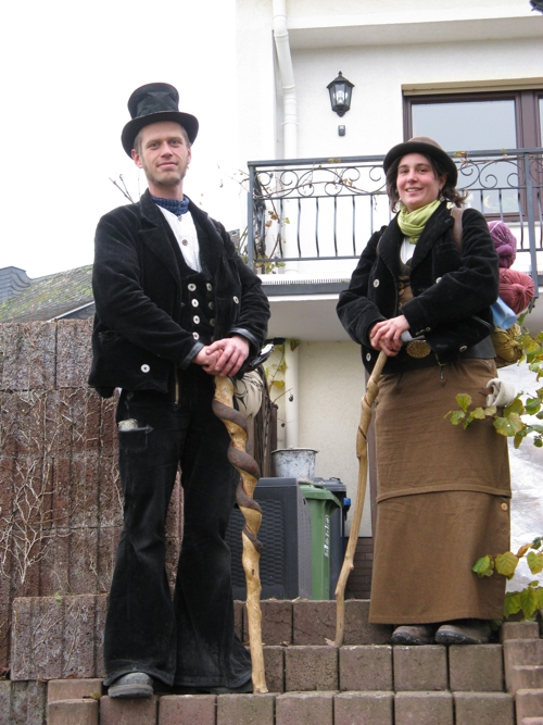 Beide, Frau und Mann sind schon längere Zeit auf der Walz. Sie unterwerfen sich damit strengen Regeln der Handwerkszünfte. Ausgerüstet mit „Sack und Pack“ ging es auf die Wanderschaft. Drei Jahre und ein Tag wird nicht nach Hause zurück gekehrt und nach möglichst vielen neuen Eindrücken und Erfahrungen gesucht. Beide haben vor etwas mehr als zwei Monaten zusammen gefunden und werden den Weg in den nächsten Monaten auch wieder getrennt fortsetzen. Er in Richtung Süden, Südsee, Sie in die Schweizer Berge, wo sie bei Ziegen und Schafen die Weihnachten zubringen will. Das Ganze in 2000m Höhe und mit ihrer Tierwelt alleine.