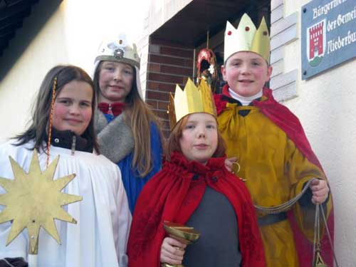 Gleich in zwei Gruppen machten sich nach dem Aussendungsgottesdienst die als die Weisen aus dem Morgenland gekleideten Gruppen, begleitet von einer erwachsenen Person auf den Weg. Während Michael Braun, Malte Peters, Philipp Rüdesheim und Maximilian Straßburger durch den östlichen Teil des Dorfes zogen waren Matthias Braun, Jonas Keßler, Antonia Lenz und Lena Sandmann im westlichen Teil unterwegs. An jeder Haustür wurden die Wünsche für das Neue Jahr und die Segenswünsche der Könige vorgetragen. Mit der geweihten Kreide wurde wieder die Haustüre gekennzeichnet und der Segensspruch ausgesprochen.