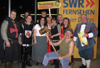 Die Redaktion der Landesschau des SWR hatte eine Niederburger Delegation eingeladen, um an der Abschlussveranstaltung der landesweiten Aktion im Sendezentrum in Mainz dabei zu sein. Zehn, als Rittersleute und mittelalterliches Markt- und Handwerkervolk ausgerüstete Ex-Hammerdörfler machten sich am vergangenen Samstag auf den Weg nach Mainz, um die vier in der Endrunde verbliebenen Gemeinden tatkräftig zu unterstützen. So waren eine Kräuterhexe, ein Schmied, drei Ritter, eine edle Jungfrau, ein Mönch, eine Wahrsagerin und der Kurfürst in Kostümen vertreten. Regie und Redaktion verteilten im undemokratischen Ruck- Zuckverfahren gleich vier der Reiseteilnehmer in die Gruppe der Jury. Die restlichen Mitreisenden wurden in den Kulissen und auf den Zuschauertribünen verteilt. Die Bürgermeister der Endrundengemeinden vollbrachten Ketten behangen Höchstleistungen in der Interview- und Fragerunde. Spannend bis zum Schluss blieb die offene Frage nach der Siegergemeinde. Letztendlich gab der Zusammenhalt der Region Mayen, Kruft und Mendig und der telefonische Erfinderreichtum der Eifelgemeinde Bell den Ausschlag für den Landessieg. Die Siegergemeinde, die schon im Juli vergangenen Jahres das Duell gegen Niederburg für sich entscheiden konnte, kann sich nun Landessieger der Hammerdörfer nennen.