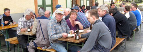 Das Küchenteam hatte zur Frühstückszeit und erst recht zur Mittagspause alle Hände voll zu tun. Helma Lief und Walter Huppertz, dem Vorsitzenden des Heimatvereins, verstärkt durch "DASTOBIS" gelingt es immer wieder, dem mittäglichen Großhunger der arbeitenden Bevölkerung mit entsprechend schneller Zubereitung und Ausgabe der Erbsensuppe mit kräftigender Einlage entgegen zu steuern. Der Platz vor dem Backhaus füllte sich bis zum letzten Platz. In mehreren Schichten wurde gegessen und auch ein paar Minuten zum Plausch genutzt.