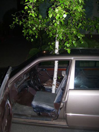 Das gab es noch nie: Ein Maibaum, besser gesagt eine sechs Meter hohe Birke, verlegt in der Walpurgisnacht kurzerhand ihren Standort im Wald in die Mitte eines stilllegungsreifen Mercedes. Direkt neben dem Schaltknauf suchte er seinen Platz, die restliche Länge lies er nach oben aus dem Fahrzeug wachsen. Neue Ideen gab es zu allen Zeiten bei originellen jungen Leuten. Den Oldie noch einmal vor der Abwrackprämie im Bild festzuhalten ist mal was Neues in der Hexennacht. Wenn sich der Niederburger Maibaum dann noch über das Schiebedach Zugang verschafft setzt das noch einen drauf. Unsere Bilder zeigen das Fahrzeug und die erstaunten Nutzer.
