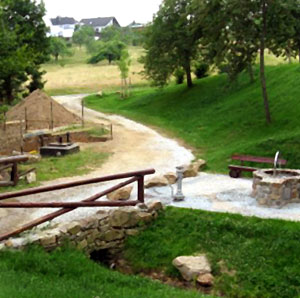 Irgendwann kam man, wahrscheinlich schweißgebadet und einen Moment ruhend, auf die Idee, einen mit Brennesselen und Dornen bewachsenen Bereich der Anlage mit einem Kneipp- Becken aufzuwerten. Gesagt - getan: