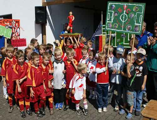 Die ersten Höhepunkte der Veranstaltung bildeten bereits der Einzug aller Mannschaften mit ihren selbstgebastelten Schildern und die Begrüßung der Teams durch den Kreis-Bambini-Beauftragten Jürgen Oldach. Nachdem das anschließende Warm-up mit „Clown Josef“ bei den Dreikäsehochs samt ihrem Anhang auch das letzte Eis gebrochen hatte, konnte das fieberhaft erwartete Turnier mit seinem reichhaltigen Rahmenprogramm beginnen. Zunächst jagten die in vier Gruppen aufgeteilten Mannschaften leidenschaftlich dem Ball hinterher. Die zuschauenden und ihre Schützlinge frenetisch anfeuernden Mütter, Väter, Omas und Opas konnten das Leder aber oftmals nicht erblicken, da selbiges durch ein immer auf Ballhöhe befindliches Knäuel ambitionierter Pimpfe umzingelt war. Während der Pausen vergnügten sich die Kids auf der Hüpfburg oder testeten ihr Geschick beim Entenangeln, Bobby-Car-Fahren, Sackhüpfen und Elefantenlaufen. Die Freude der Kleinen angesichts des vielfältigen Spielangebots war unverkennbar und von Langeweile demzufolge überhaupt nichts zu spüren. Hiervon konnten sich auch Hans Christmann, Vorsitzender des Fußballkreises Rhein-Hunsrück-Mosel und Verbandsjugendleiter Peter Lipkowski bei ihren Besuchen in Niederburg überzeugen.