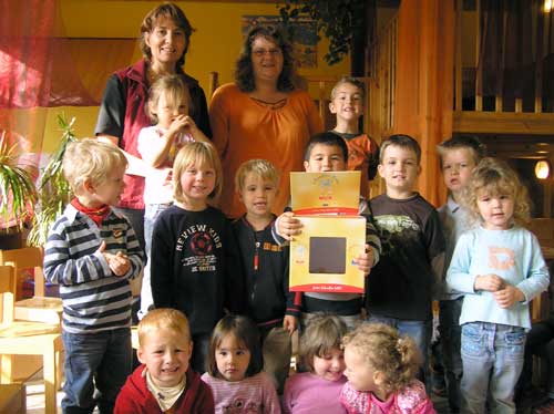 Auf dem Bild sind die KiGa Leiterin Frau Karbach des Amselnest in Damscheid, Frau Muders und die Kinder, die fleißig gespendet haben.