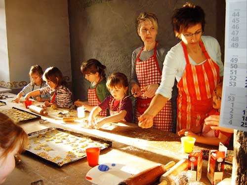 Die "Vorschulkinder" des Kindergartens Urbar hatten sich einen Nachmittag ausgesucht, um gemeinsam mit ihren Erzieherinnen und Müttern Plätzchen nach alten Rezepten im holzbeheizten Backofen selbst zu formen und auf Backbleche zu legen. Im riesigen Backofen wurden die Teigformen zu duftenden Weihnachtsköstlichkeiten, die die Kinder mit Freude sofort verzehrten oder als Überraschung mit nach Hause nahmen.