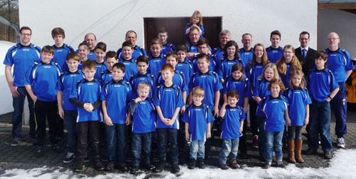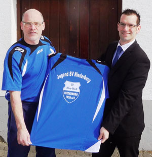 Zusammen mit Stephan Gutenberger, Kundenberater von der Volksbank Rhein-Nahe Hunsrück, konnte am letzten Wochenende Jugendleiter Holger Link dem Nachwuchs des SV Niederburg ihre neue Bekleidung überreichen. Die T-Shirts wurden zu großen Teilen durch eine 500 Euro Spende der Volksbank Rhein-Nahe-Hunsrück finanziert. Einen weiteren Teil der Kosten wurden durch die Kinder, Jugendlichen und Betreuer als Eigenanteil übernommen, den Rest übernahm die Jugendkasse.